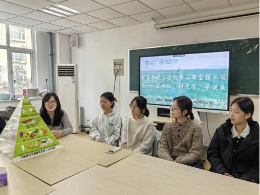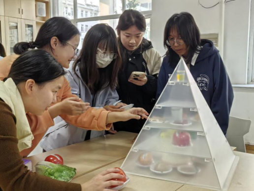 食品系副主任续晓琪副教授引导大家采用食品感官评定的描述性检验、嗜好性检验等方法品鉴固态杨枝甘露、煎饼果子等多款备受同学们喜爱的网红美食产品,并结合制作工艺,探讨其中呈味物质的奥秘。续老师以“膳食宝塔”为模型,分层直观展示各类食物的推荐摄入量,随后同学们通过“宝塔归位赛”,将五大类食物模型准确摆放到膳食宝塔的对应层级中,在实际操作中学习营养知识,以游戏化方式引导参与者掌握科学膳食搭配,让营养知识变得生动而深刻。最后,同学们针对校园内常见的饮食方式与中国营养学会发布的膳食指南展开比对与探讨,并现场计算了自己一日三餐所摄入的能量及各类营养素含量。通过实际测算,大家一致认为应当避免盲目跟风“网红美食”,树立起科学饮食、理性消费的健康观念。现场老师还为同学们提供了贴近日常生活的三餐搭配建议,助力大家将知识转化为实际行动。